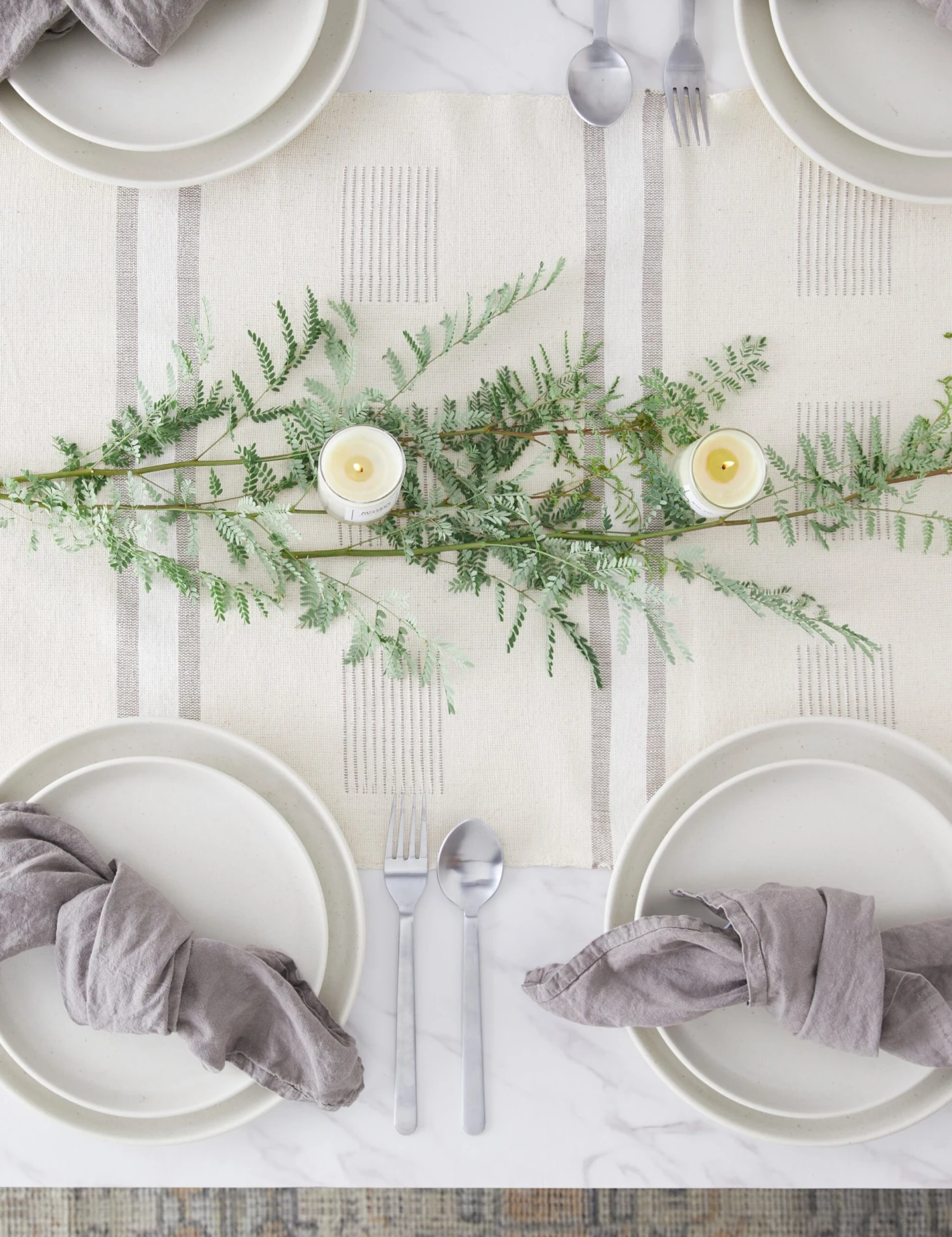 Set off your tabletop style with the artisanal touch of the Dash runner from Minna. This handwoven runner’s neutral palette and striped design can offer a sophisticated foundation from your dining room table to an entryway console. Each piece is made by a family-run cooperative in Mitla, Mexico.