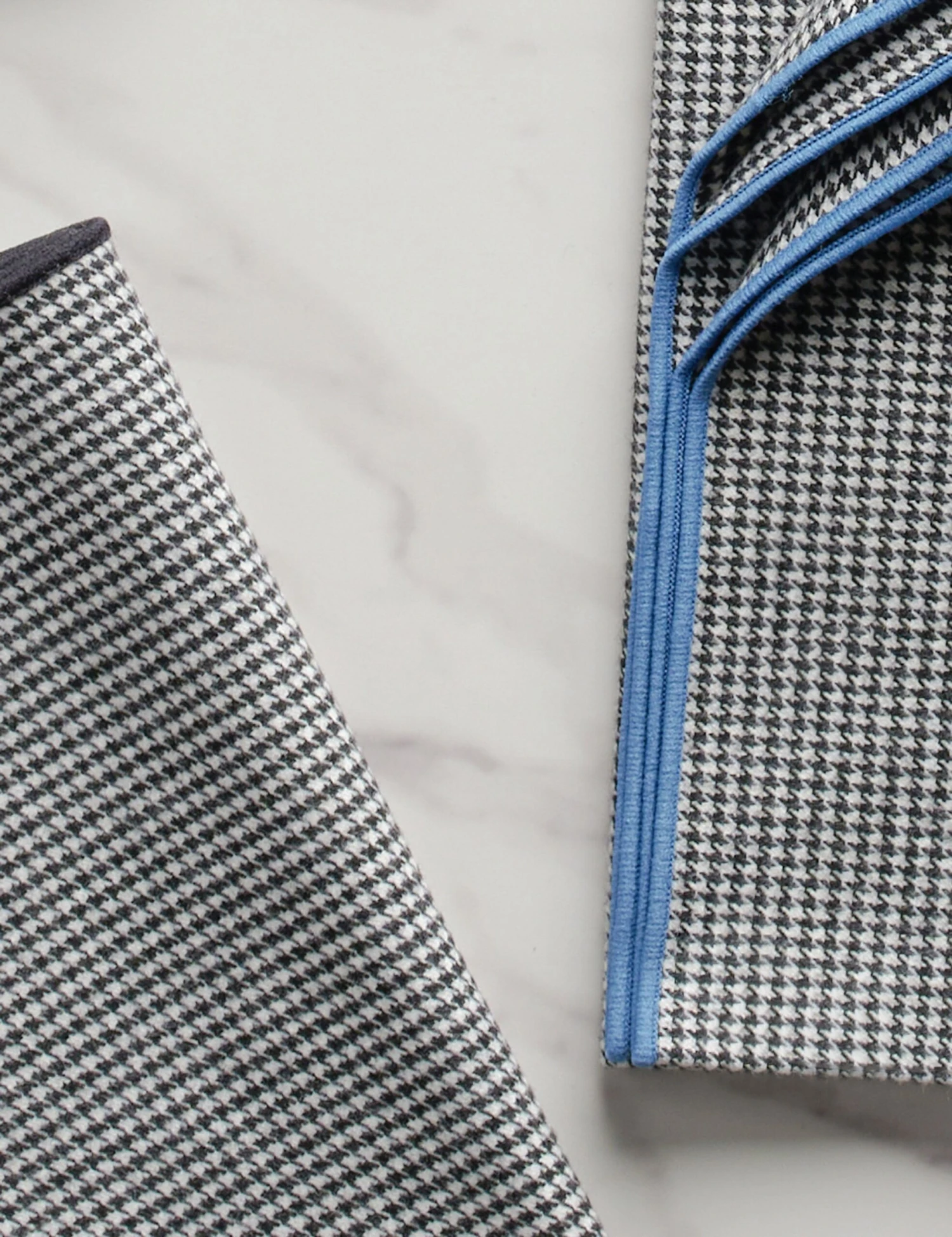 Atelier Saucier sets a modern table with sustainably made, high-quality linens in always-fresh styles. These napkins are the perfect touch to elevate your entertaining. The houndstooth pattern styles an elegant accessory for any occasion—with a different trim on each napkin for a personal touch.