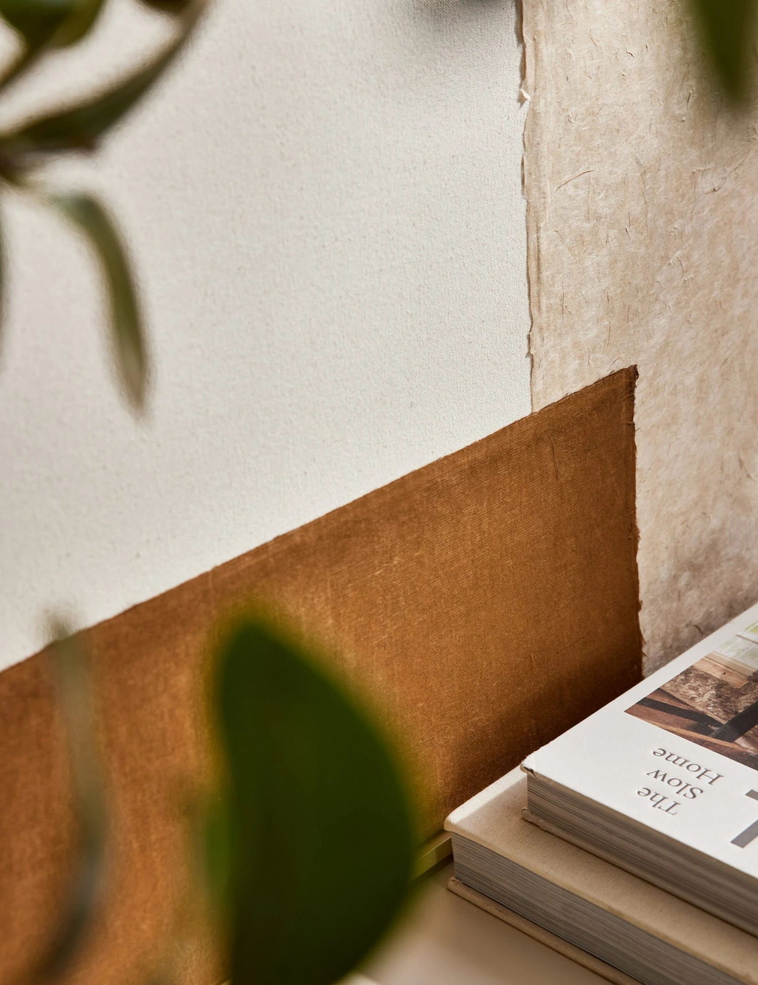 Visual Contrast is a Los Angeles-based fine art studio that produces limited-edition runs of high-quality wall art. A member of their artist collective crafts each by hand, creating unique and timeless works. Layers of fabric and handmade paper bring depth and texture to this mixed media collage—with a touch of color to stimulate your wall decor.