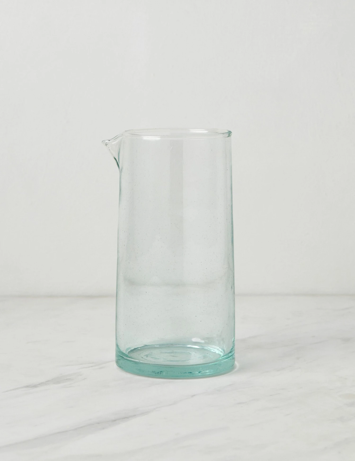 Made in collaboration with Moroccan artisans, this handmade glassware is crafted with recycled glass for a unique tint, subtle bubbling, and tapered profile that varies slightly from piece to piece for a bespoke touch. This pitcher is the perfect complement to your drinkware collection and the ideal size to offer the table water or share a cocktail.