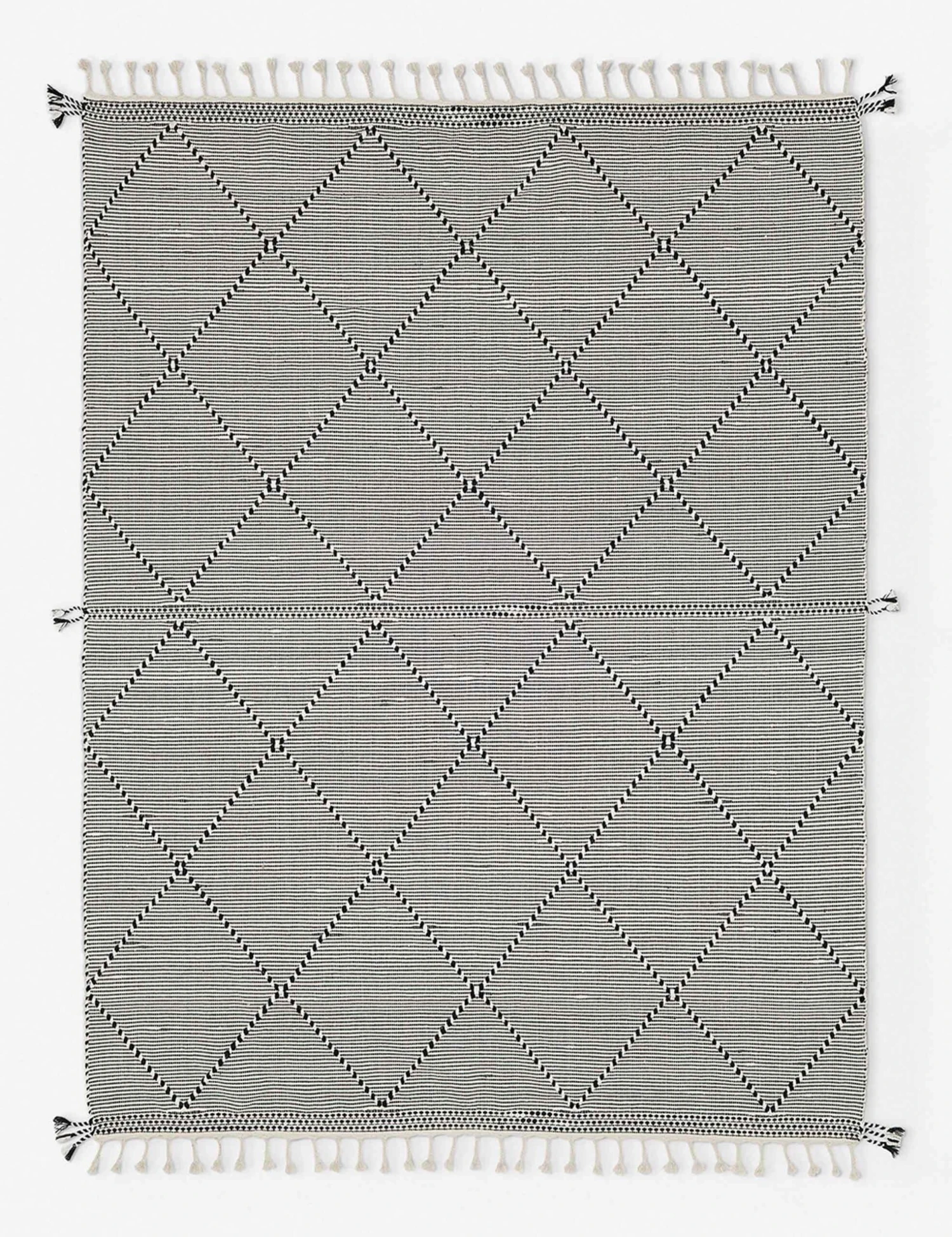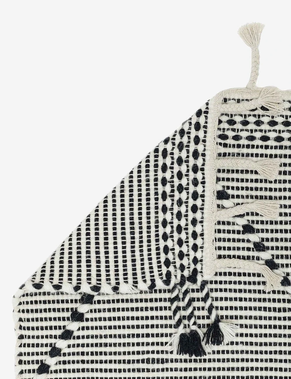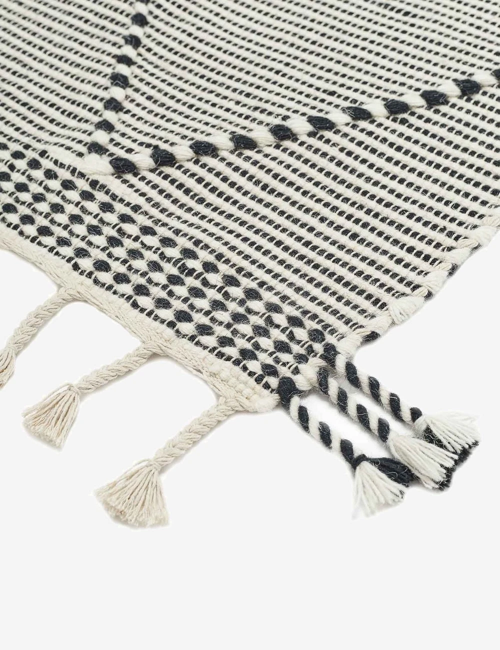 Inspired by traditional Moroccan flatweaves, our durable Taza Rug is constructed from high quality materials, and features a classic geometric design and subtle fringed details. This black and white rug pairs well with minimalist and bohemian decor in neutral tones.