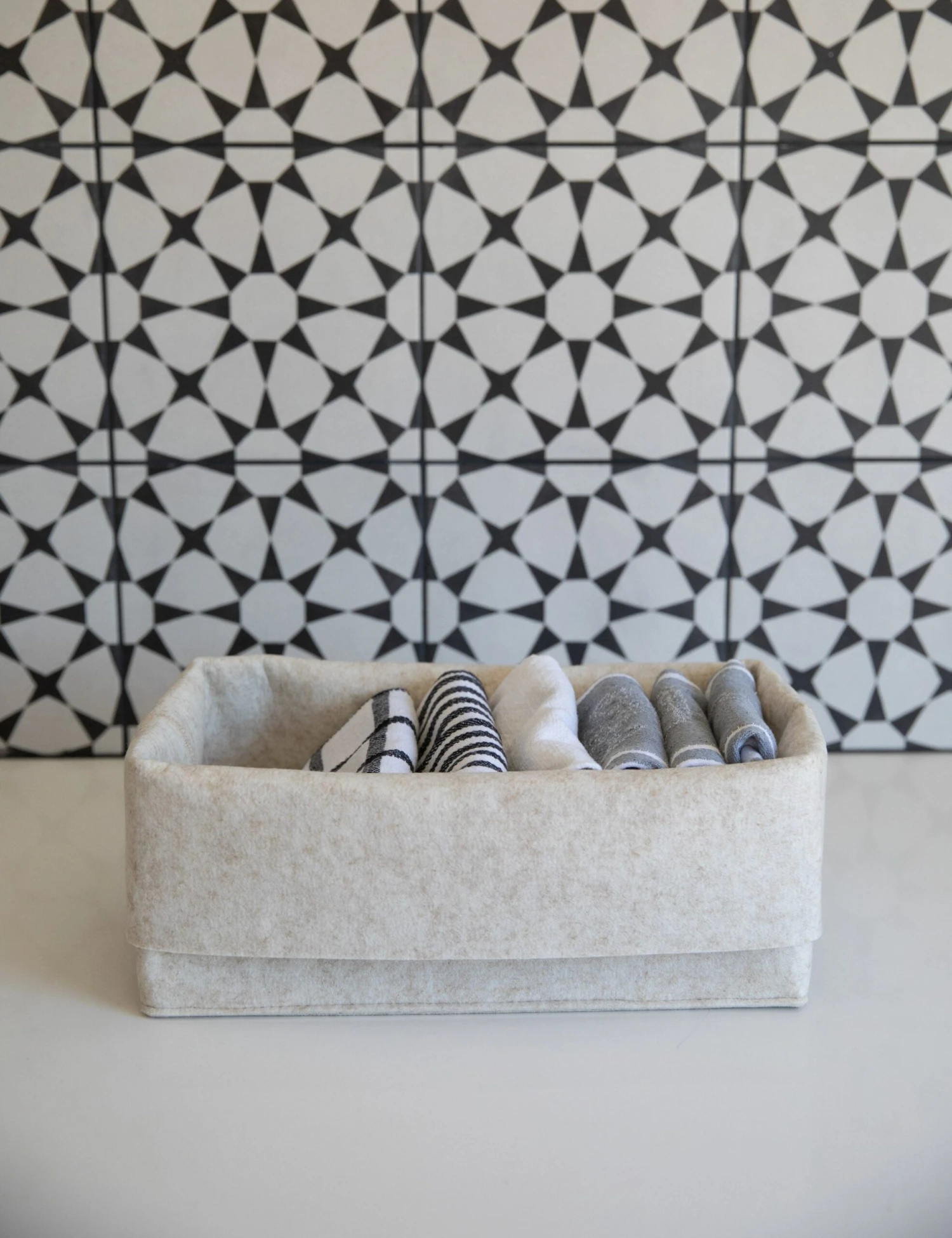Discover flexible storage appeal with this versatile storage bin in a style tailored to your space. The dynamic design holds its shape but can fold over for an adjustable height so you can fit a lower profile for easy access or unfold for a taller, sleeker look—plus, this storage bin is made of felt derived of recycled plastics that can be washed for easy care.